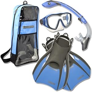 I'm a scuba diver and bought this U.S.Divers Diva 1 Lx / Island Dry Lx/ Trek / Travel Bag for my wife who loves to snorkel. This is a great package for traveling, the fins are shorties but truly effective and comfortable; the mask seals great around the face, has easy adjustable straps and the lens offers a great view. Oh man the snorkel is worth its weight in gold! It's a dry snorkel which means you can dive down under to grab sea shells or whatever and come up without any water in the snorkel. The snorkel breaths super easy too and if you did manage to get water in the tube, there is purge valve - so with an easy puff of breath, you can clear the water quick ; easily. I paid $10 extra for the bright hot pink ($79 total /w free shipping). I'd say it was worth it for a couple of reasons; 1) I could easily look out across the water and quickly spot the hot pink, 2) she looks great in the hot pink and also received lots of cool kudos.